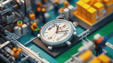 This detailed image showcases a stopwatch positioned within a vibrant manufacturing environment, emphasizing the importance of time management in industrial processes.