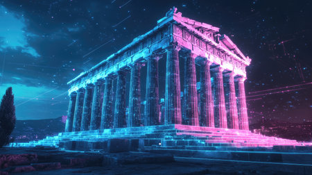 A futuristic vision of the Parthenon, glowing with digital blue and pink hues, merging ancient history with modern technology.
