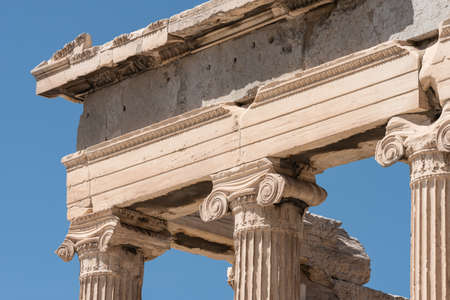 Detail of classical greek architecture, Ionic columns and cornice, Acropolis, Athens
