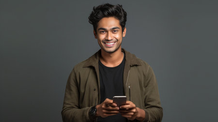 Love this music Handsome young man in headphones holding mobile phone and smiling while standing against grey background : Generative AI