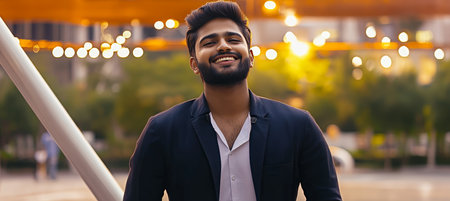 Portrait Of A Confident Young Indian Man Smiling, Businessman In A Suit, City Life Background