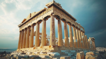 Explore the stunning beauty of an ancient Greek temple with impressive columns set against a dramatic sky, highlighting the rich history and cultural heritage.