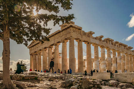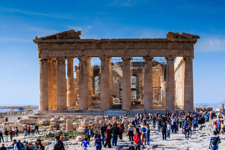 Athens, Greece - March 2, 2025: The Parthenon, Greece most iconic ancient temple, dominates the Acropolis landscape as visitors walk among its historic ruins.