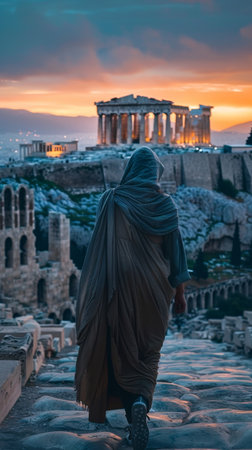Greek toga at Parthenon ruins, Athens glowing at dusk, heritage pride.