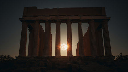 Eerie eclipse light over Greek temple sun partially hidden by moon