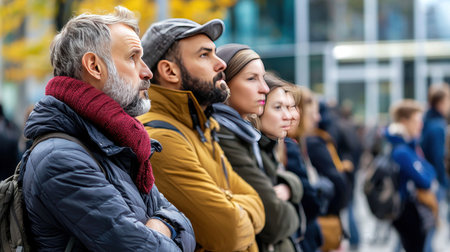 A diverse group of people, including a grey-bearded man with a textured red knitted scarf and a quilted dark blue jacket, standing with arms crossed, looking forward intently.