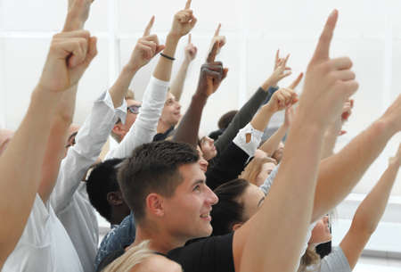 cropped image of a group of young people pointing up