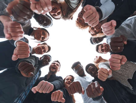 team of young people makes a decision standing in a circle