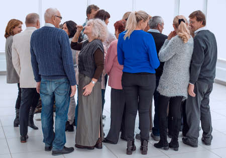 a group of old people standing with their backs indoors