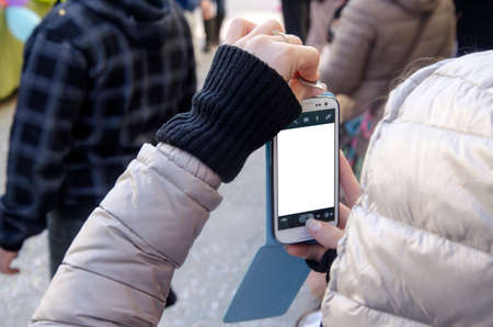 Female hands taking picture with smartphone and white screen among people as moder lifestyle