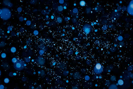cloud of multicolored particles fly in air slowly or float in liquid like sparkles on dark blue background. Beautiful bokeh light effects with glowing particles for holiday presentations