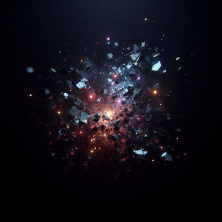 Abstract colourful particles explosion on blue background.