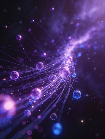 This captivating abstract illustration features glowing light trails and sparkling particles against a dark background, perfect for artistic designs and projects.