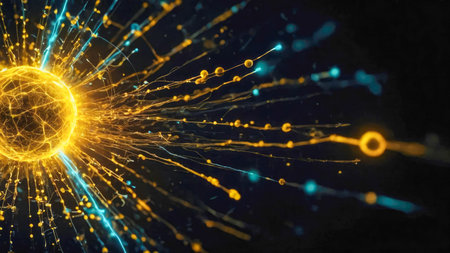 An artistic depiction presents a network structure, highlighted by a radiant central light source. The illustration features interconnected nodes and lines, utilizing cool blue tones against a dark background. This style could be used for conceptual visualizations regarding information, technology, or scientific concepts, suitable for diverse editorial or commercial applications.