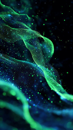 Digital art showing luminescent waves of green and blue particles elegantly flowing against a black background, creating depth and movement for a captivating modern feel.