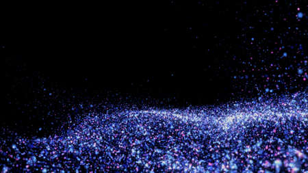 3D Render of many small ultraviolet and blue particles flying on black festive background. Trendy backdrop for your design. Three-dimensional illustration. Innovation and technology concept