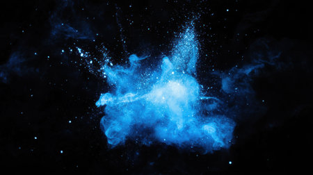 A blue-white explosion of dust and debris in the black sky. Fireworks of holi colors. The blue and white colors are bright and attractive, creating a feeling of energy and excitement. The image is dynamic and visually vivid