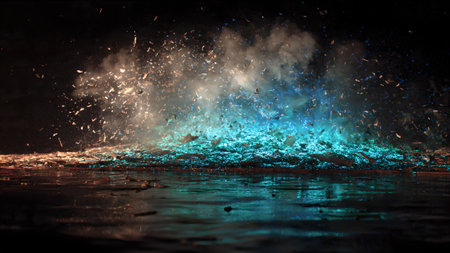 A striking blue explosion erupts amidst flying debris in a gritty urban environment, showcasing energetic motion and dramatic effects, ideal for impactful visuals.