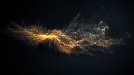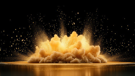 Stunning explosion of golden particles creates mesmerizing visual effect, showcasing shimmering dust and sparkling fragments against dark background. dynamic movement evokes sense of energy