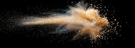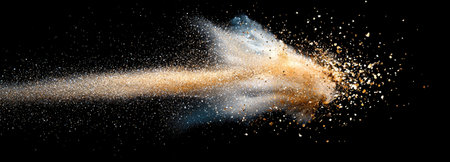 Sand explosion, golden grains dispersing on black background