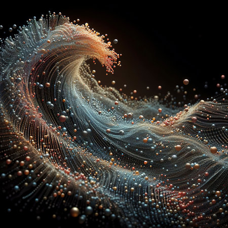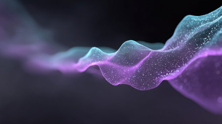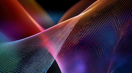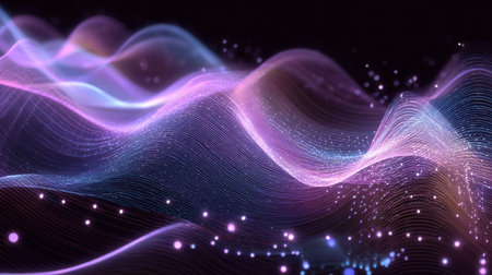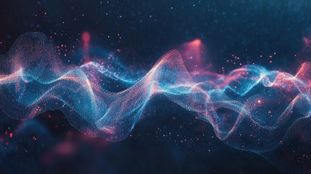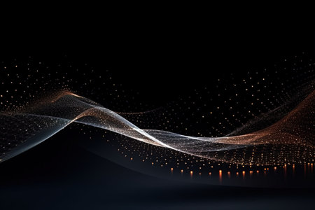 Experience the stunning interplay of light and color in this abstract image of flowing waves with particles, evoking a sense of magic and wonder in dark space.