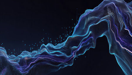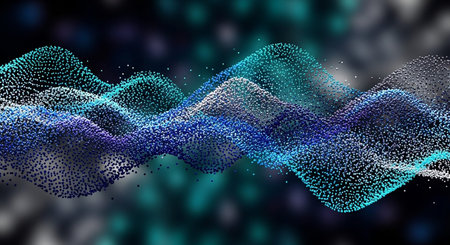 Flowing abstract blue waves with digital dot patterns forming smooth curves in motion.
