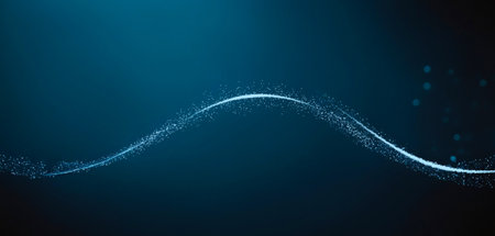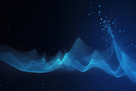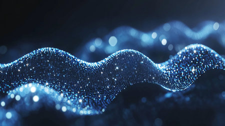 Digitally created image depicts a glowing blue wave composed of tiny sparkling particles against a dark blue background.