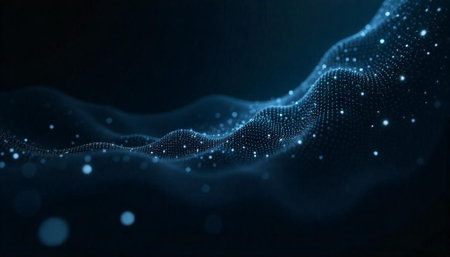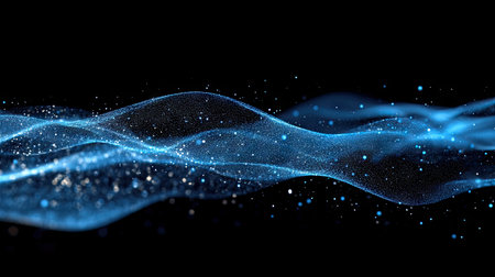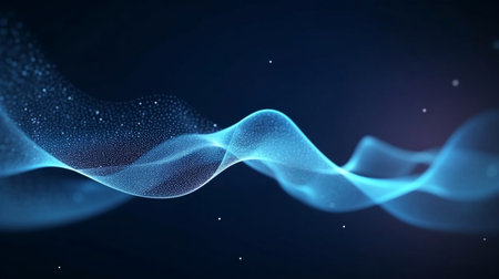 A flowing abstract wave of light particles on a dark blue background, creating a sense of motion and depth.