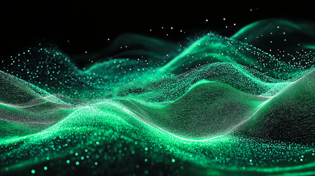 Experience the beauty of abstract digital representations of water waves, illuminated by glowing particles, creating a tranquil atmosphere in a dark space.
