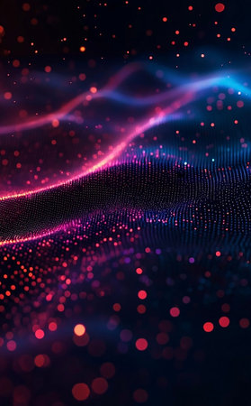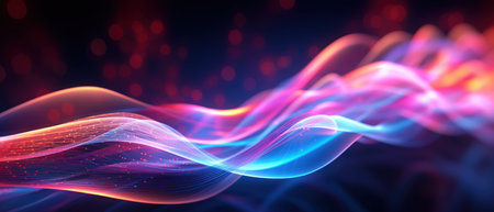 This vibrant and colorful abstract background features flowing light particles in a dynamic wave pattern, ideal for technology and art projects.