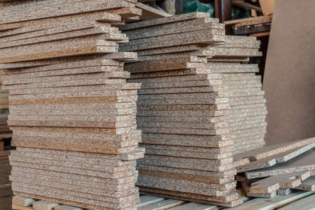 Stack of particle board panels with wood grain texture in a workshop, illuminated by sunlight.