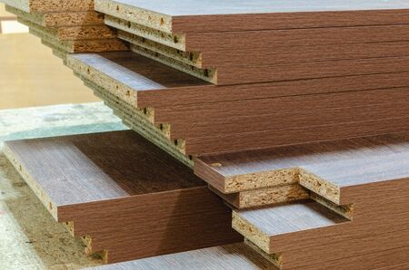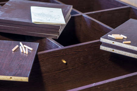 Chipboard sheets and components for furniture assembly close-up. Manufacturing and self-assembly of furniture at home. parts are spread out on floor.