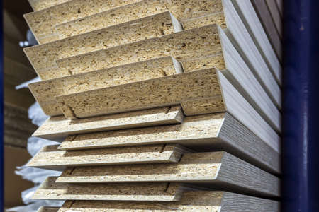 Samples of fibreboard panels with wood texture. Laminated CPD. Chipboard PVC edge. Wooden furniture CMD and MDF.