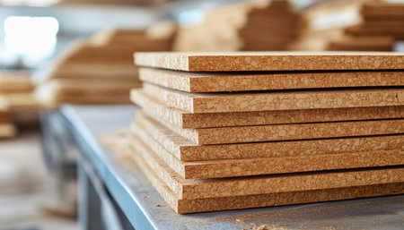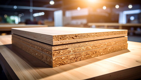 Close up of a particle board slab showing wood chip texture in an industrial setting with soft lighting.