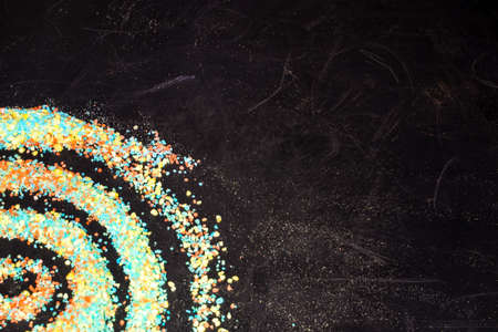 spiral of colorful multicolored crystals on a black board, with space for text, background image