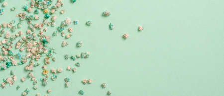 Decoration with gypsophila flowers with copy space on light green background, flat lay