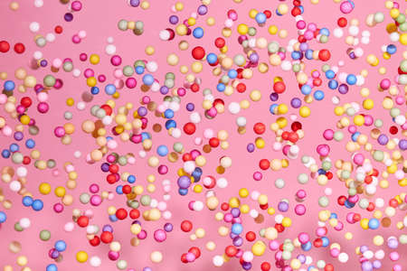 Flying small multicolored polyfoam balls, theme of holidays and birthdays, backdrop.