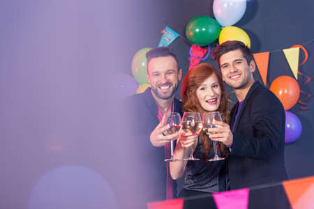 Cheerful friends hanging out together, celebrating holiday and having fun. Clinking glasses