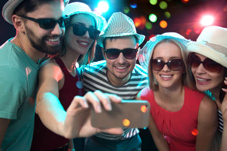 Group of friends taking selfie with mobile phone having fun at the party at night. Crowd of happy multiethnic people