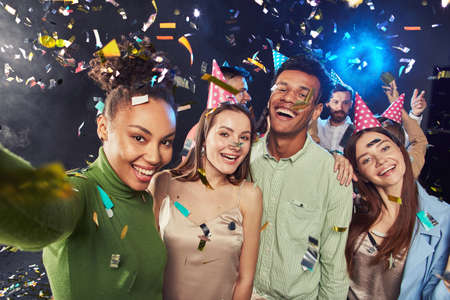 confetti party Multiethnics happy young people group celebrating new year eve while dancing and have fun at home