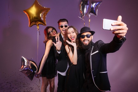 Group of young boys making selfie portrait on mobile phone while having fun at a party