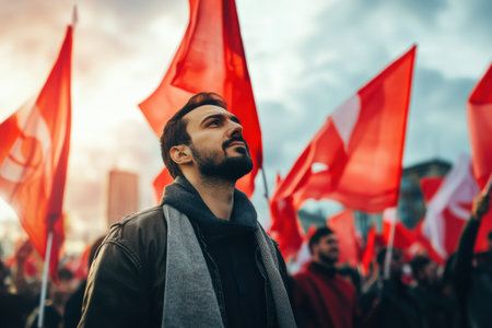 A leader stands before a sea of waving flags and an enthusiastic crowd, embodying the intense emotions of a political rally as the sun sets.