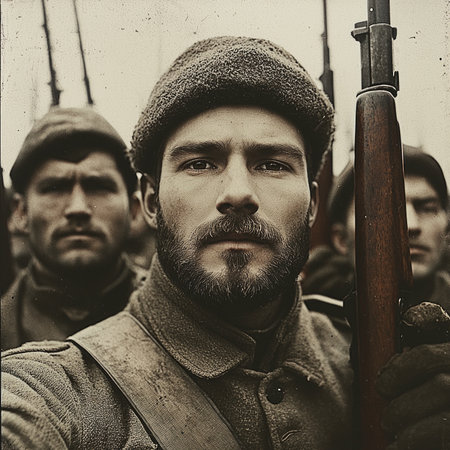 group of World War I soldiers stands together proudly holding rifles while posing for a newspaper. Their serious expressions reflect the gravity of the era.
