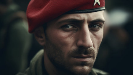 Confident young adult with beard in casual cap outdoors looking serious generated by artificial intelligence