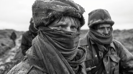 The workers faces are obscured by thick scarves and hats protecting them from the harsh elements of the bog