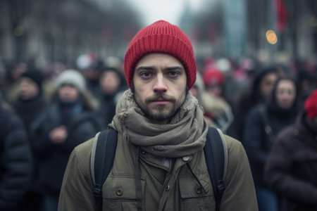 A diverse group of people, including a grey-bearded man with a textured red knitted scarf and a quilted dark blue jacket, standing with arms crossed, looking forward intently.