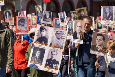 Lipetsk, Russia - May 9, 2019: Action Immortal Regiment. People come with photos of the military in World War II.