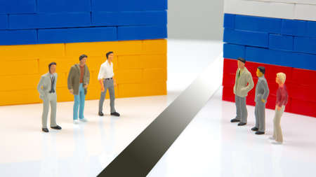 miniature people. Confrontation between two countries of peoples. National Ukrainian and Russian flag from colored blocks constructor. The problem of relations between countries. Russian aggression against Ukraine.