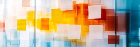 Abstract background showcasing colorful sticky notes on a transparent surface, representing business ideas, brainstorming, and innovative concepts in a modern office environment