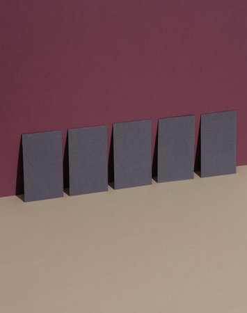 Gray business cards on beige burgundy background with shadow. Creative layout